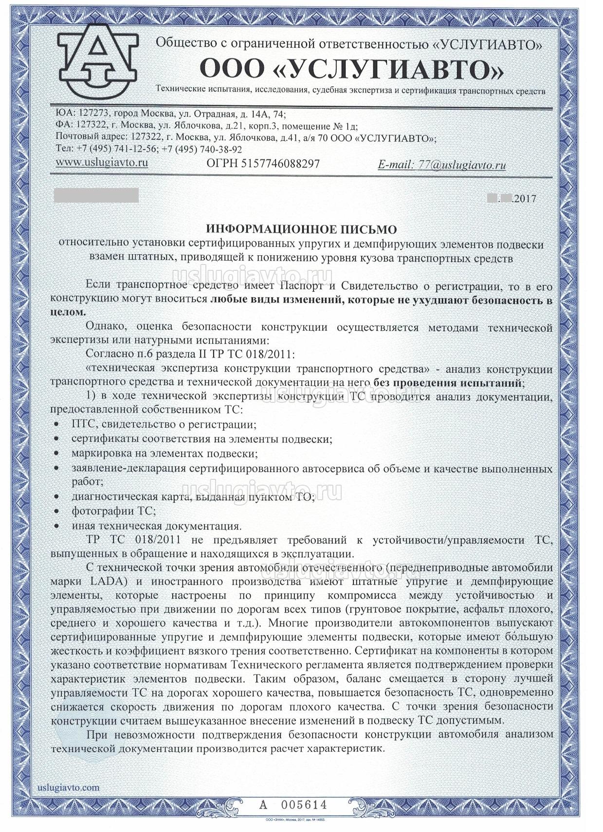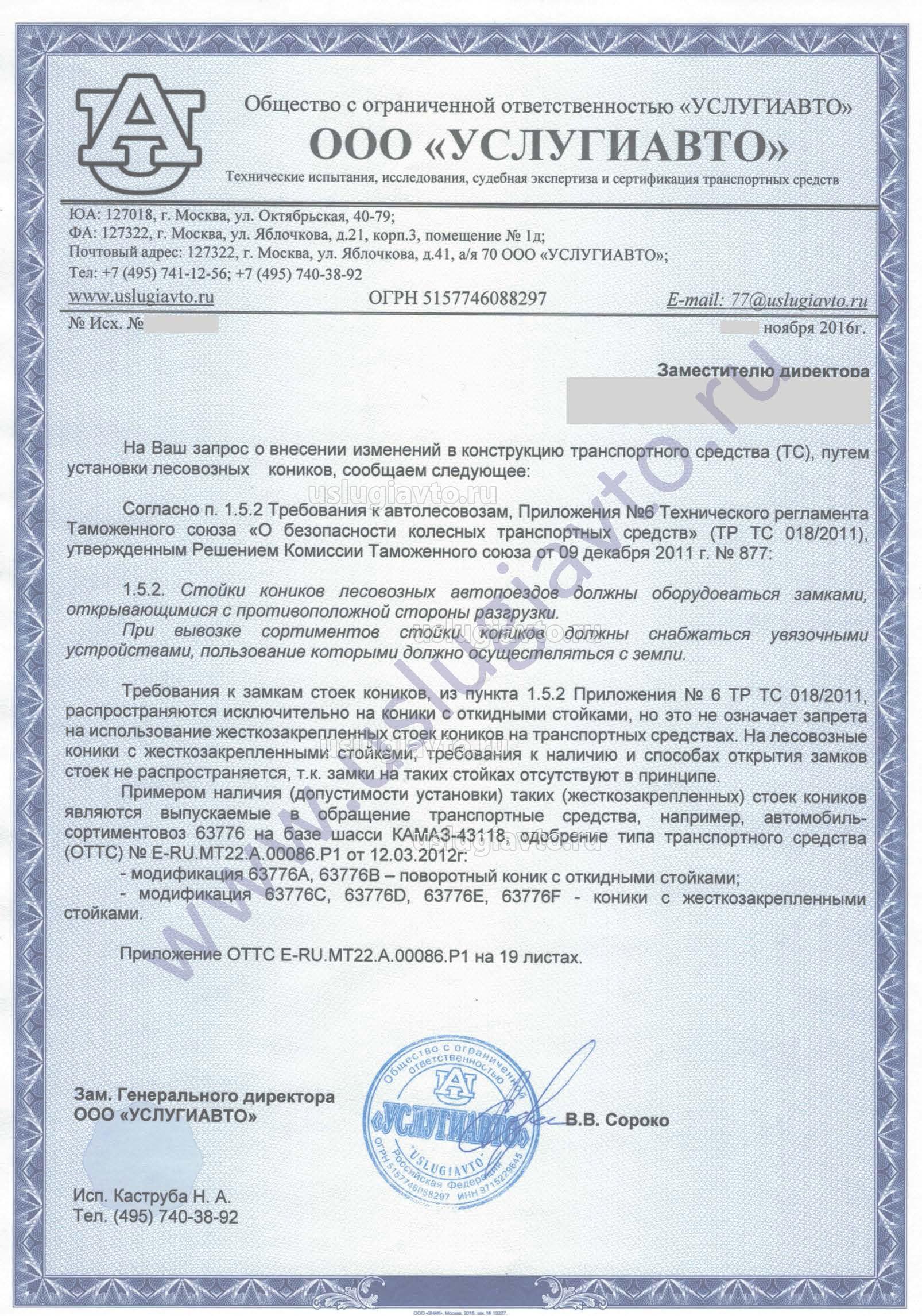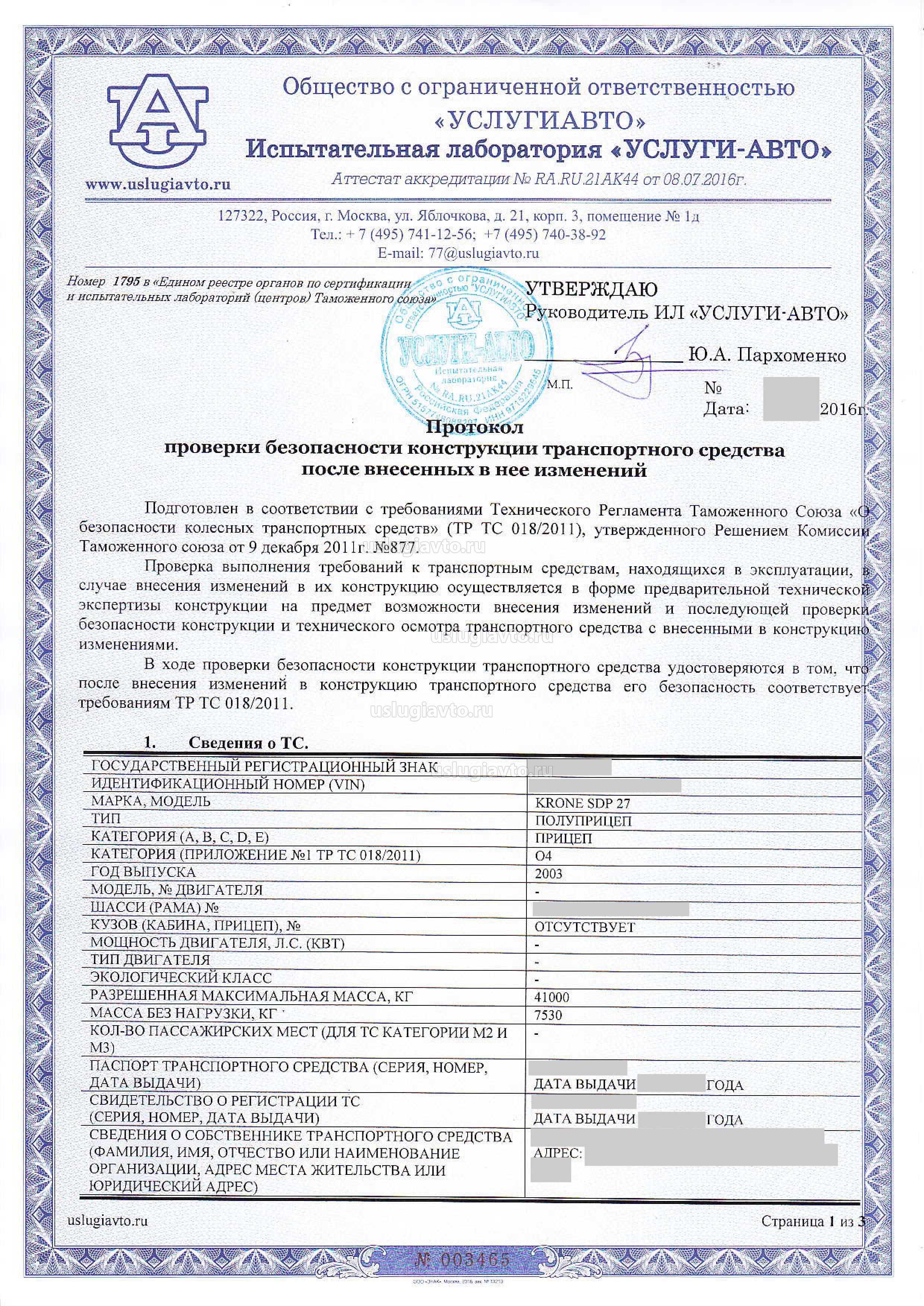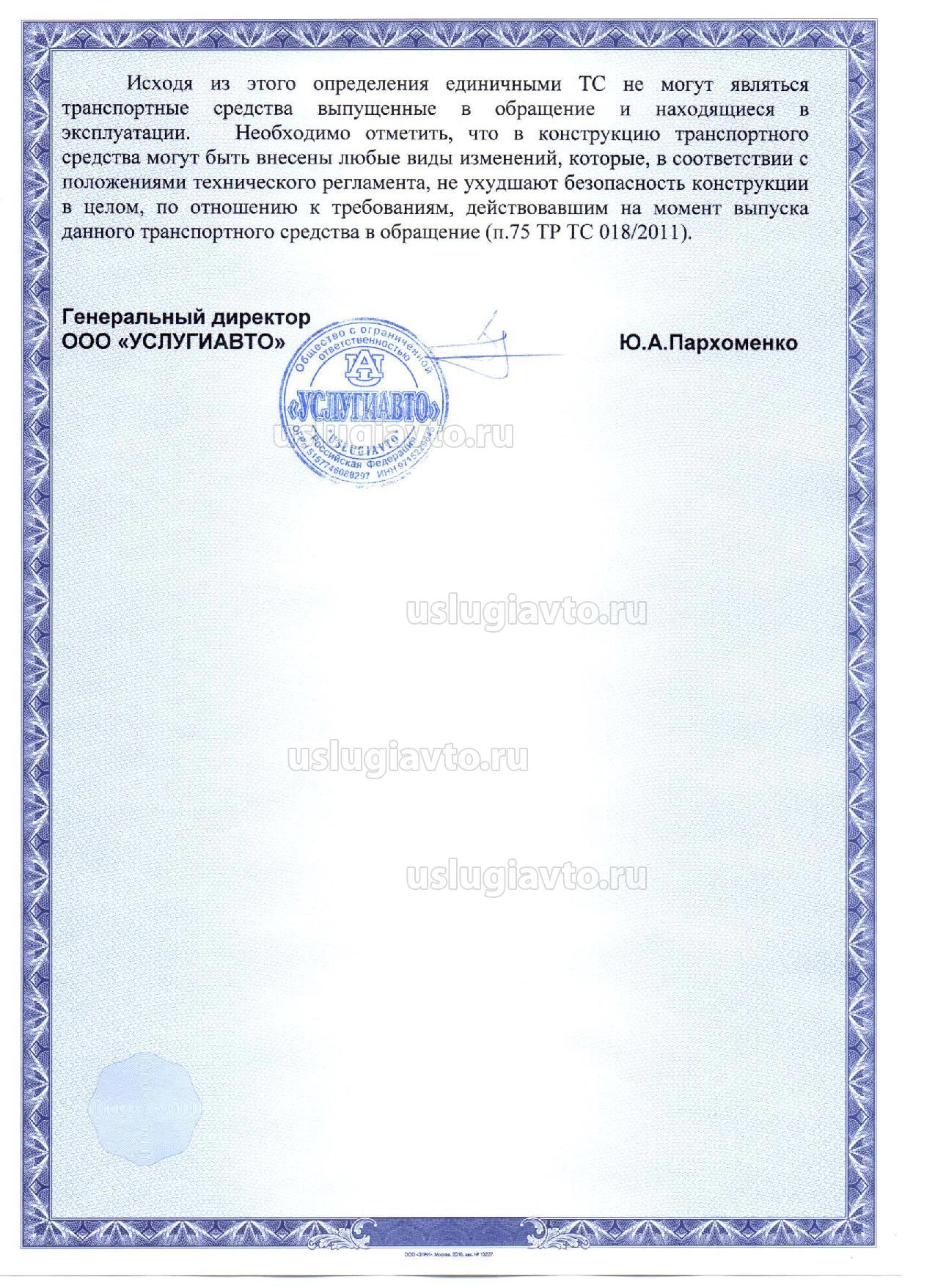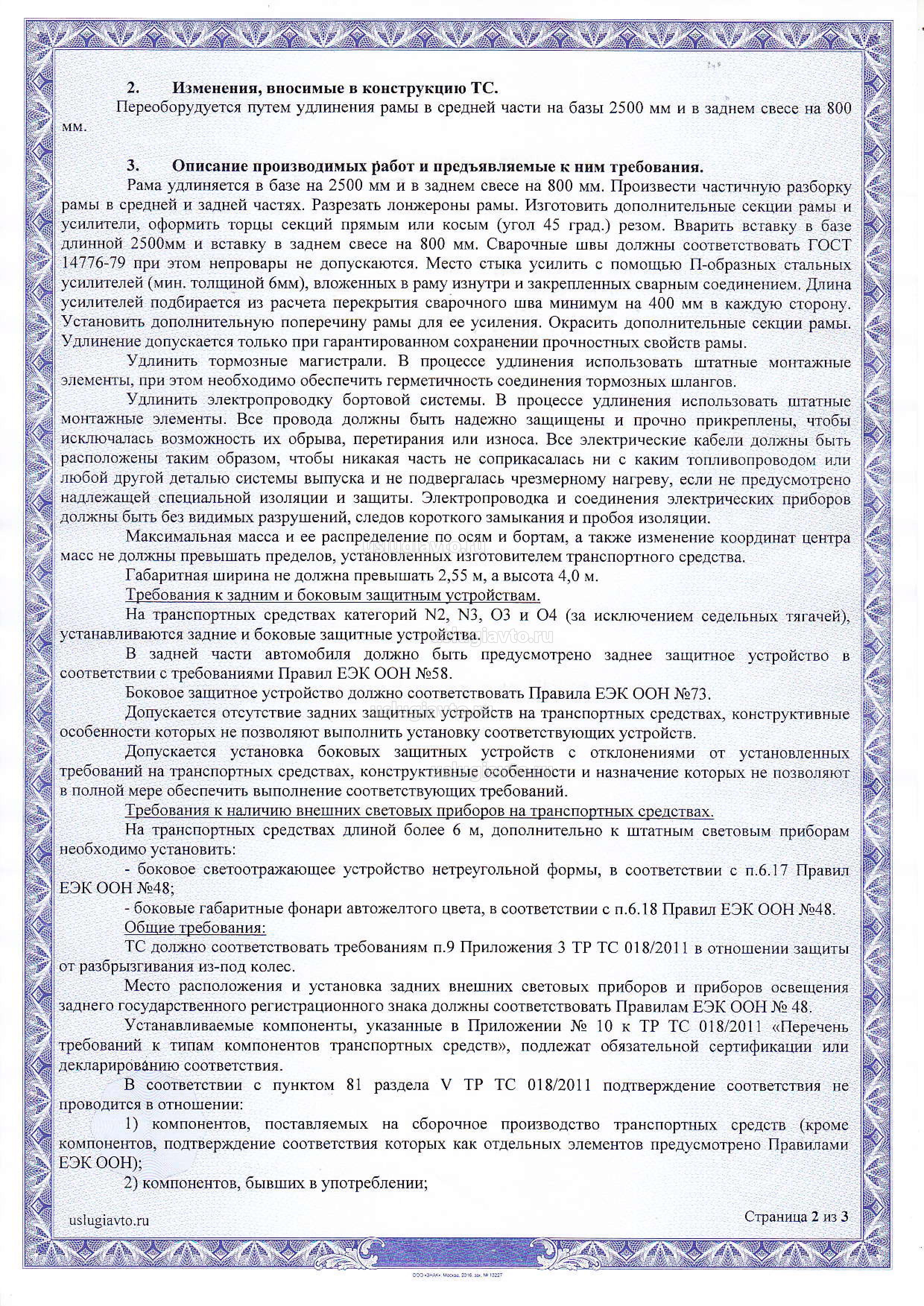 2. Подтверждением допустимости вносимых в конструкцию ТС изменений, является оформленное аккредитованной на раздел 4 (п.75-80) ТР ТС 018/2011 испытательной лабораторией - «Заключение предварительной технической экспертизы…» и «Протокол…» в тексте, которого подробно описаны вносимые изменения и предъявляемые к транспортному средству требования.