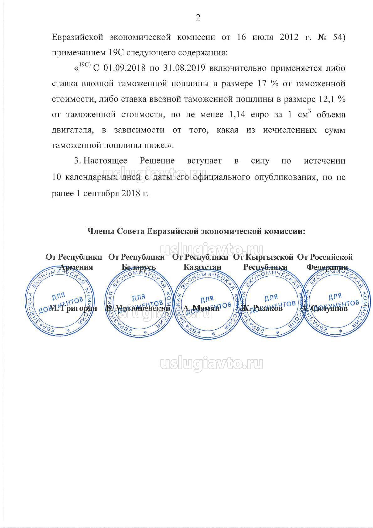«19С) С 01.09.2018 по 31.08.2019 включительно применяется либо ставка ввозной таможенной пошлины в размере 17 % от таможенной стоимости, либо ставка ввозной таможенной пошлины в размере 12,1 % от таможенной стоимости, но не менее 1,14 евро за 1 см3 объема двигателя, в зависимости от того, какая из исчисленных сумм таможенной пошлины ниже.».