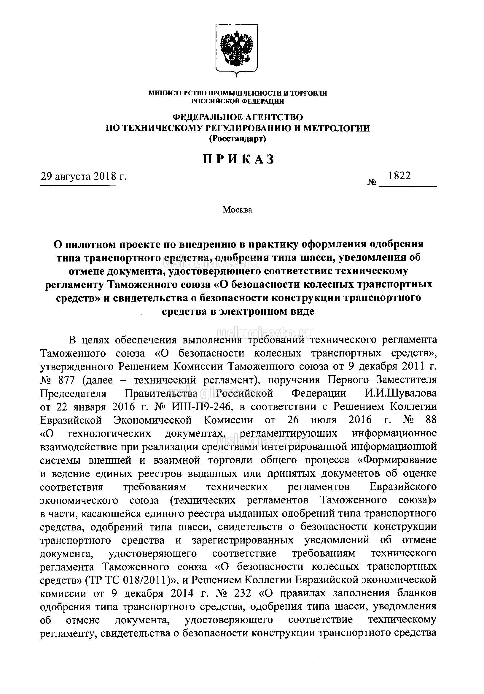 Приказ Росстандарта № 1822 от 29.08.2018 г.