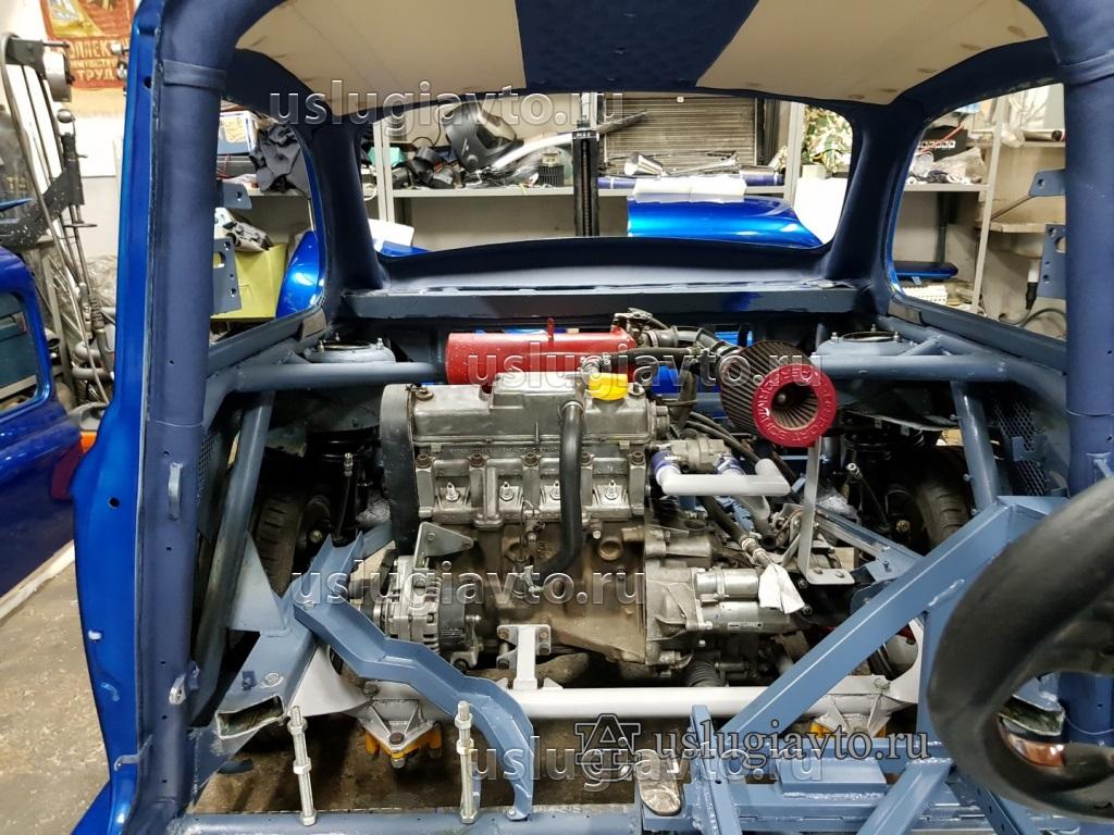 Установлен двигатель модели ВАЗ 21083 с использованием штатных кронштейнов и подушек