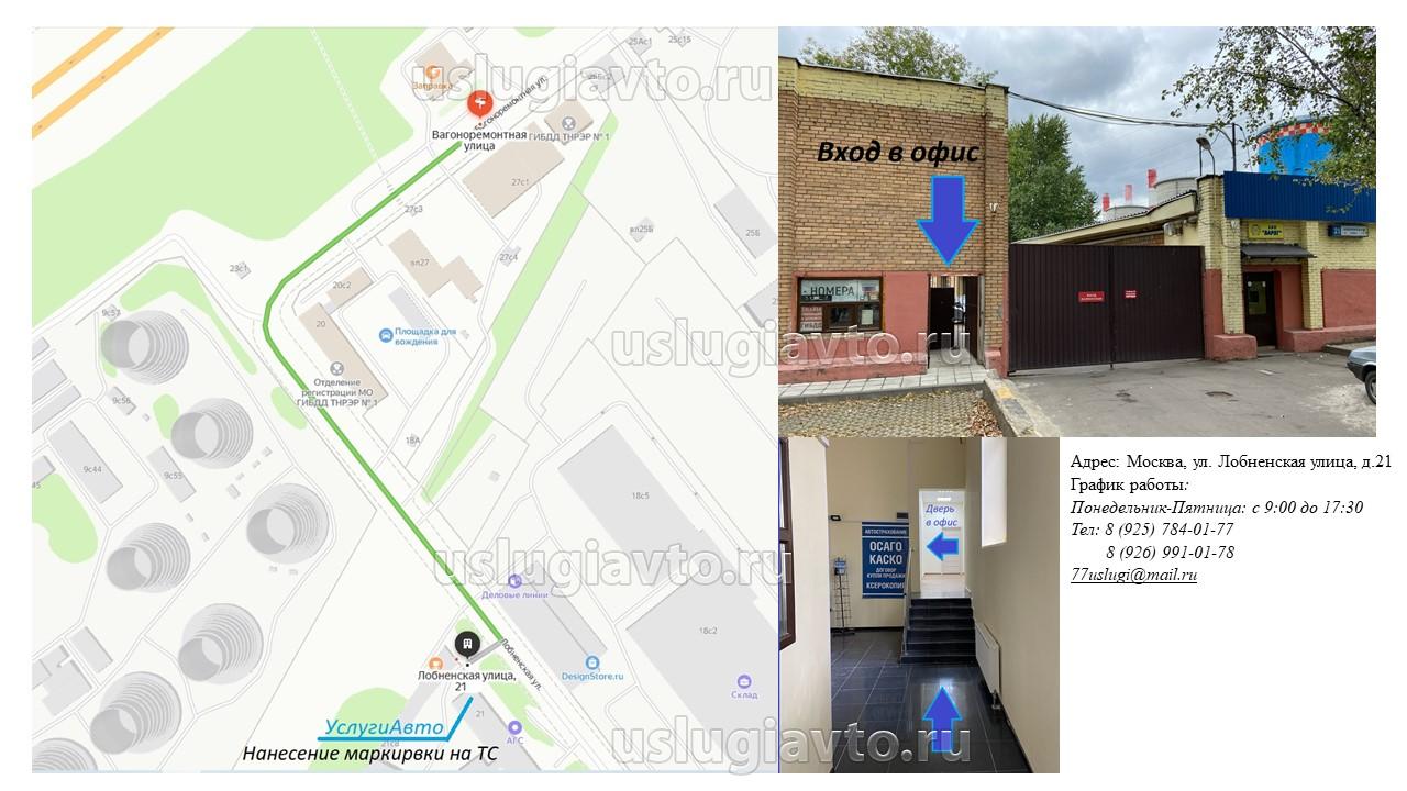 г. Москва, ул. Яблочкова, дом 21, корпус 3, офис 1Д, 7 этаж (метро Тимирязевская) офис 2Е (экспертиза ТС) офис 1Е (оформление электронных ПТС) г. Москва, ул. Лобненская д.21, стр.9 (территория ЗАО "Варяг") Нанесение полицейской (дополнительной) маркировки |