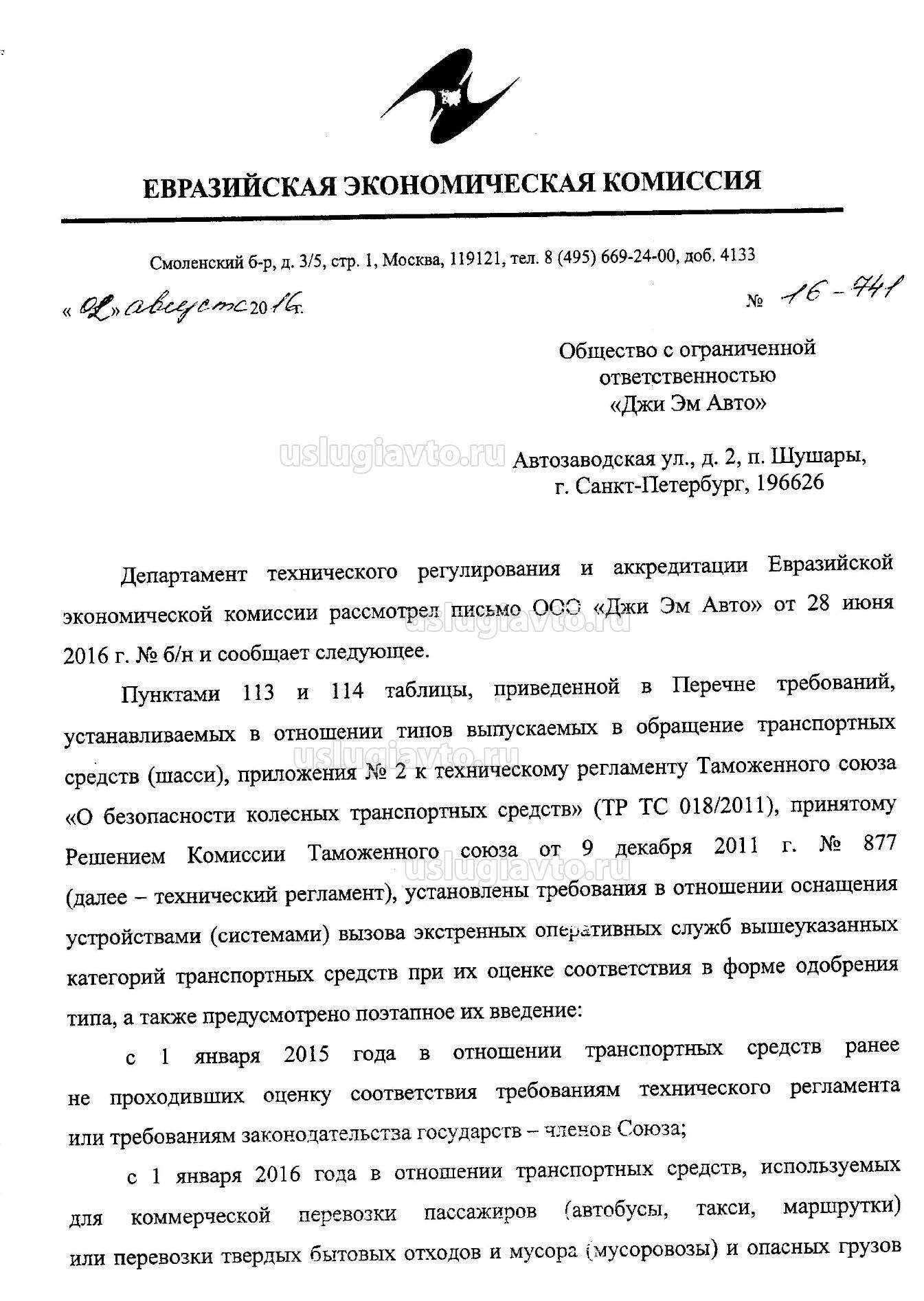 Департамент технического регулирования и аккредитации Евразийской экономической комиссии рассмотрел письмо ООО «Джи Эм Авто» от 28 июня 2016 г. No б/н и сообщает следующее: