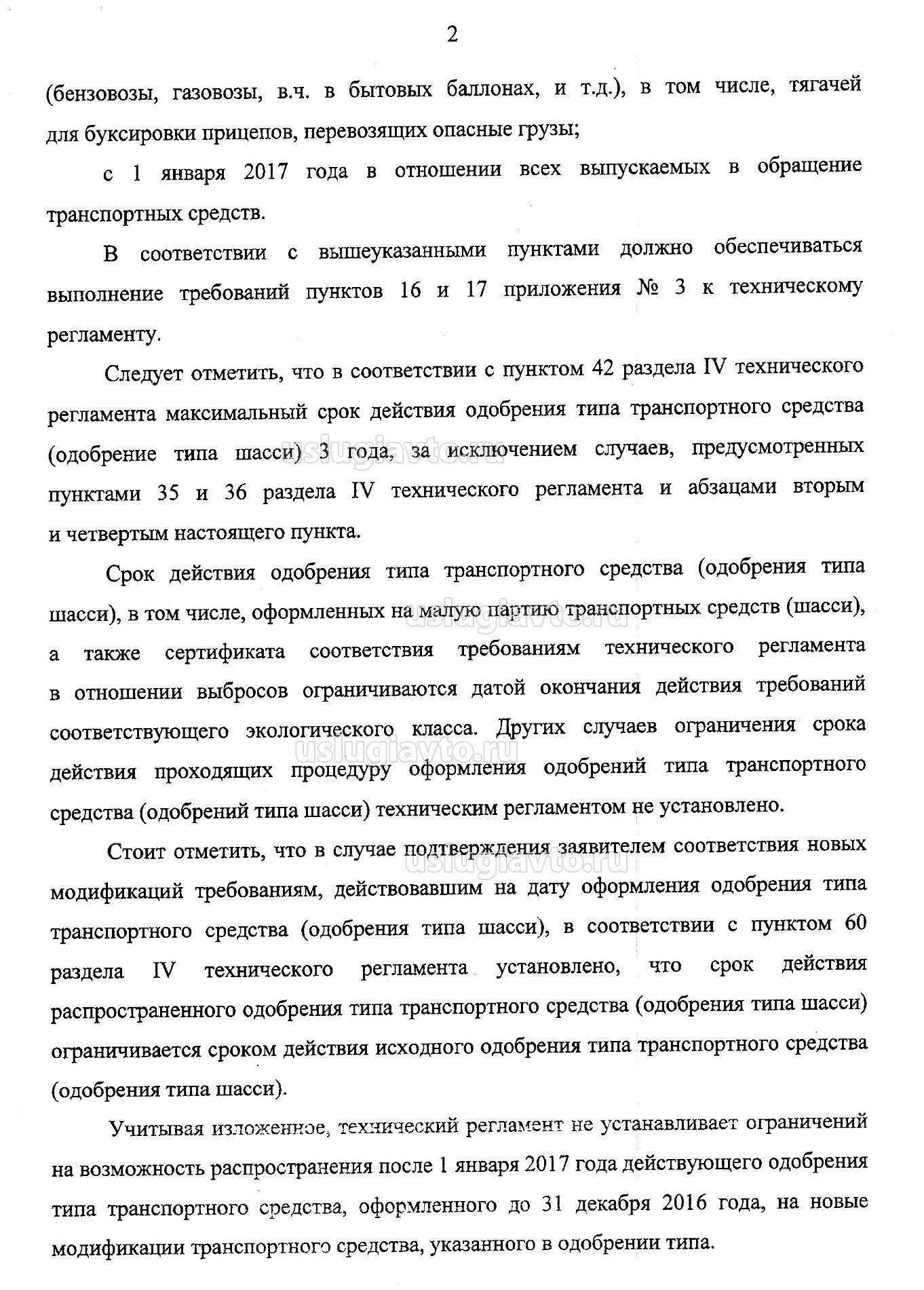 Учитывая изложенное, технический регламент не устанавливает ограничений на возможность распространения после 1 января 2017 года действующего одобрения типа транспортного средства, оформленного до 31 декабря 2016 года, на новые модификации транспортного средства, указанного в одобрении типа.